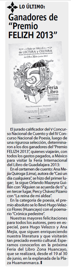 Solo 4 de Diario Correo, 08 de junio de 2013: Ganadores de «Premio Felizh 2013» admin 8 de junio de 2013 Sin categoría